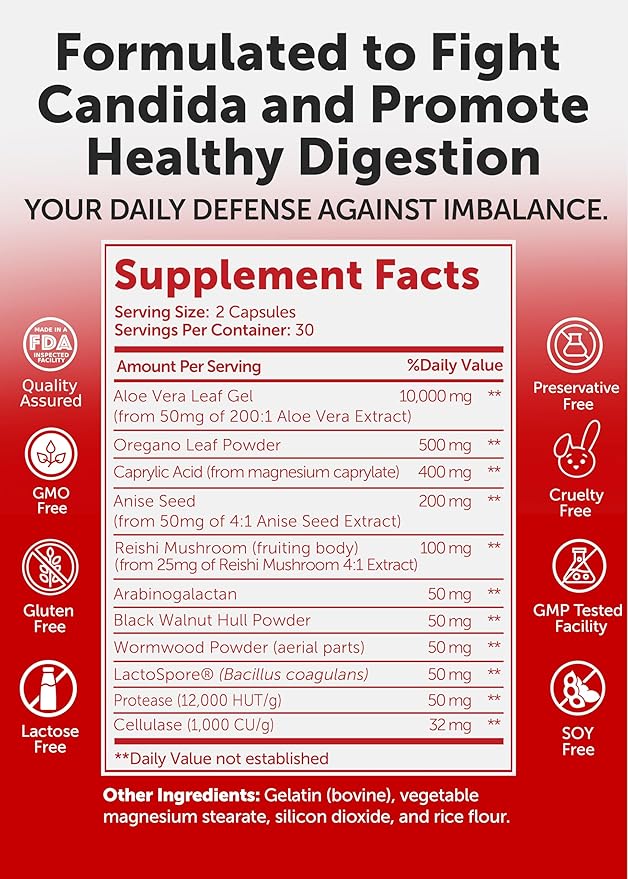- Candida Supplement with Caprylic Acid - This antifungal supplement supports candida balance with well-researched ingredients like wormwood, aloe vera, reishi mushroom, and anise seed.