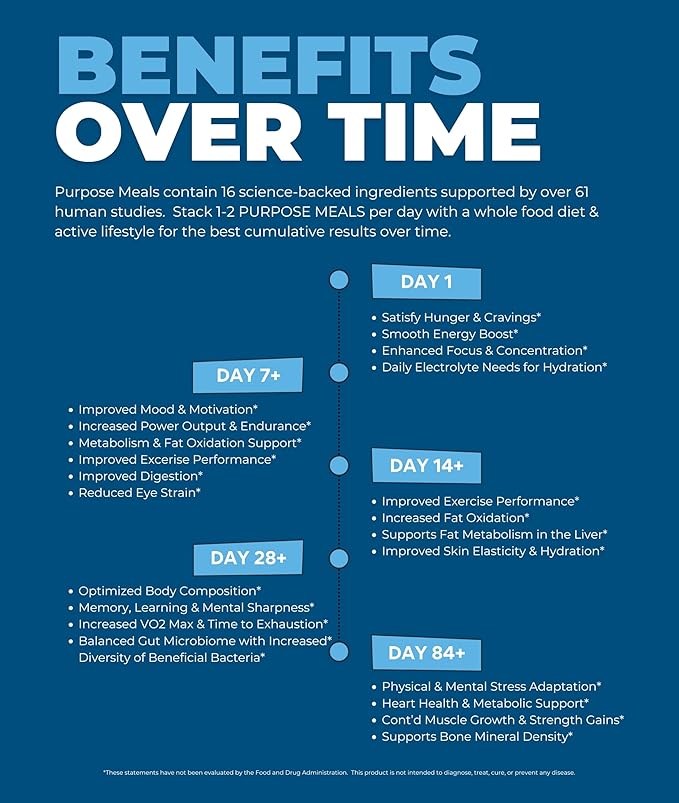- SAVE OVER $150 A MONTH: Replace 9 Products w/ PURPOSE MEALS meal supplement including Grass Fed Whey Protein Isolate & Collagen, Creatine, Prebiotic Fiber & Postbiotics, C8 MCT Oil, Organic Mushrooms, Electrolytes Hydration, Energy Drink & Nootropic.