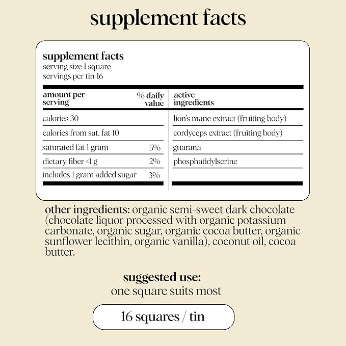 - Premium Quality Ingredients - Brainstorm features fairly traded organic dark chocolate, organic Lion's Mane and organic Cordyceps from 100% fruiting body mushrooms, guarana, and phosphatidylserine. Vegan, gluten-free, dairy-free, and kosher with 66mg of natural caffeine