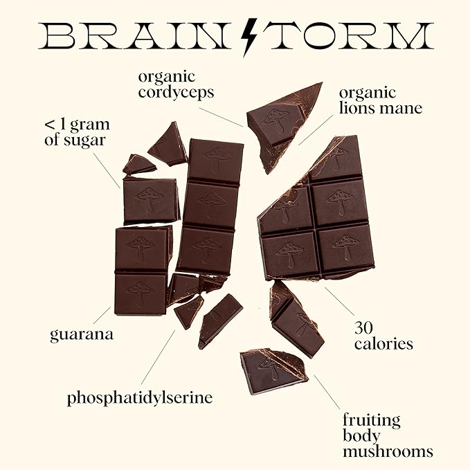 - Premium Quality Ingredients - Brainstorm features fairly traded organic dark chocolate, organic Lion's Mane and organic Cordyceps from 100% fruiting body mushrooms, guarana, and phosphatidylserine. Vegan, gluten-free, dairy-free, and kosher with 66mg of natural caffeine