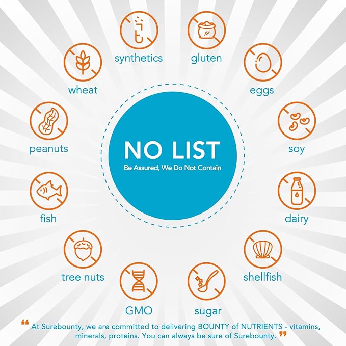 - No Allergens or Nasties: Surebounty has always been dedicated to formulating supplements that cater to people from all walks of life and can easily fit into their daily routines. We want you to enjoy the amazing benefits brought by our products without worrying about getting allergic. Be Assured: NO GMOs, soy, gluten, milk, sugar, egg, wheat, corn, nut, fish, shellfish. And never will you find Nasties like artificial ingredients, fillers, binders, or preservatives in Surebounty!