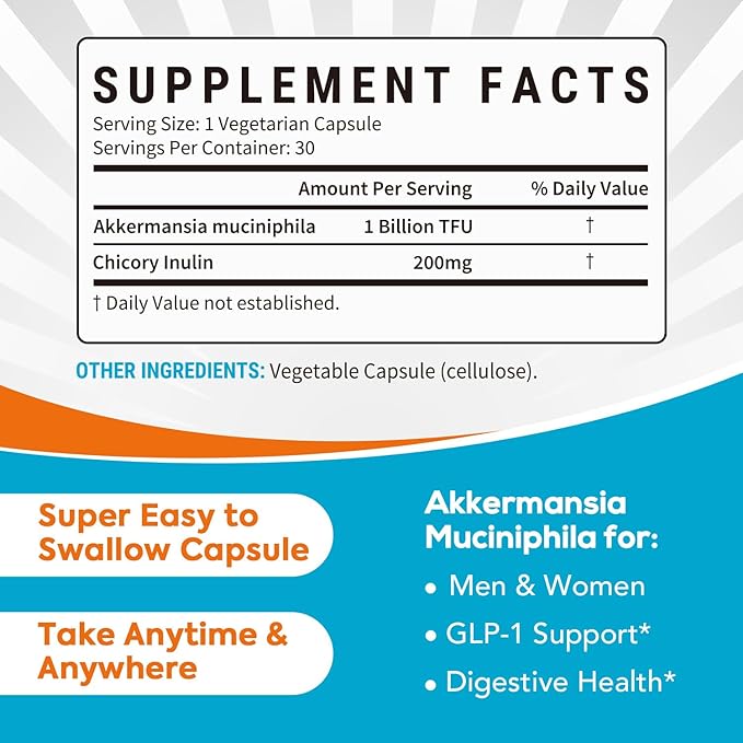 - Natural GLP-1 Booster*: Surebounty’s 1 vegan capsule packs cutting-edge probiotic & prebiotic – 1 billion of pasteurized akkermansia muciniphila and 200 mg of chicory inulin - specially designed to support the body’s natural GLP-1, metabolism, and digestion.* Take One vegan capsule daily, Feel Light, Eased & Energetic with Surebounty Akkermansia Muciniphila!*