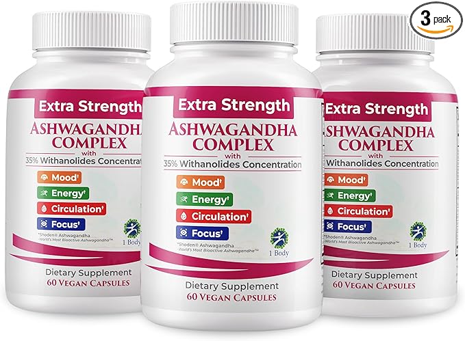 1 Body Ashwagandha Complex Supplement, Focus and Energy Support, 180 Vegan Capsules