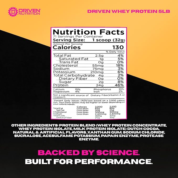- Driven Whey is packed with 23 grams of protein per serving and is rich in all the needed branched chain amino acids (BCAAs).