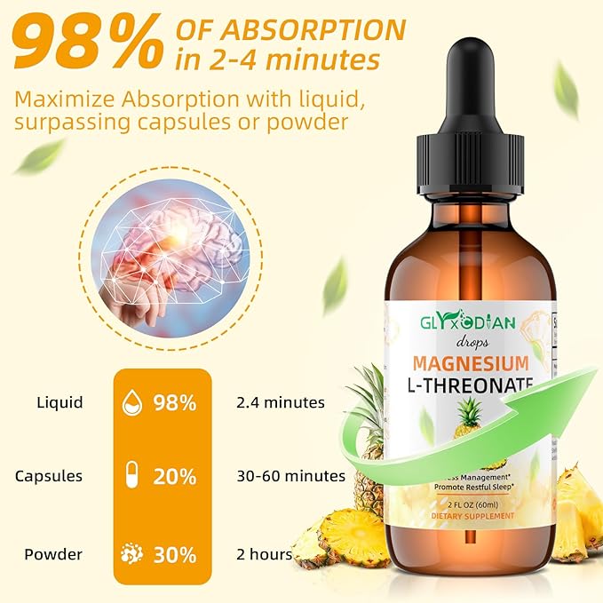 - Advanced Absorption Formula:Magnesium L-Threonate liquid drops which is absorb 5X faster than Magnesium Glycinate Liquid Drops,pills or gummies, with a 98% absorption rate. Perfect for busy adults seeking quick results without digestive discomfort