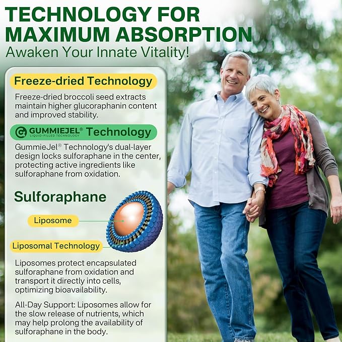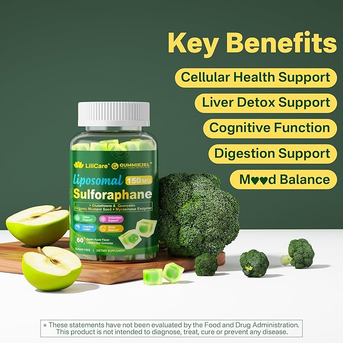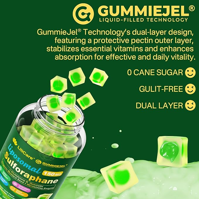 - Liposomal Sulforaphane & Yummy Taste: Using advanced GummieJel technology, we encapsulate essential compounds like sulforaphane from broccoli sprouts in the inner layer to enhance stability and absorption. Phosphatidylcholine (from Sunflower Lecithin) is added to form liposomal sulforaphane to better enhance absorption of sulforaphane, glutathione, and other antioxidants. All in a delicious, green apple-flavored gummy you’ll look forward to taking every day.