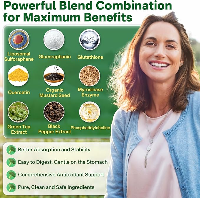 - Natural Energy & Immune Strength: With 100mg quercetin and 50mg green tea extract—standardized to 95% polyphenols and 45% EGCG—this sulforaphane blend strengthens immunity, supports healthy infl♡mmation response, and naturally boosts daily energy. Black pepper extract enhances absorption, ensuring each active ingredient works harder for you. Stay strong, energized, and protected while supporting skin health, immunity, and overall wellness year-round.