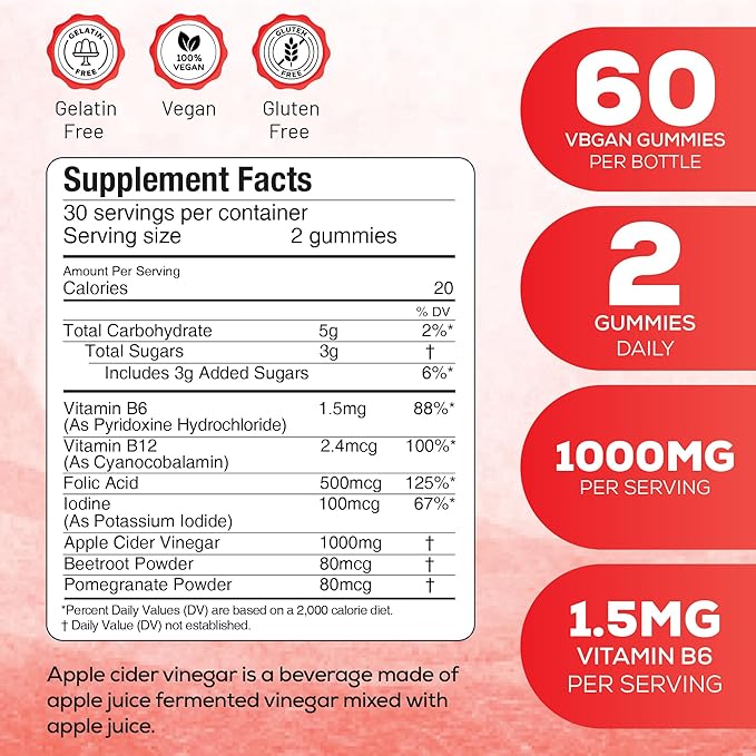 - Special Ingredients : apple cider vinegar Gummies, Vitamin B6/B12, Folic Acid