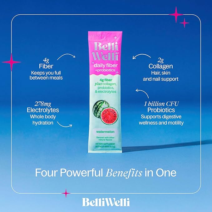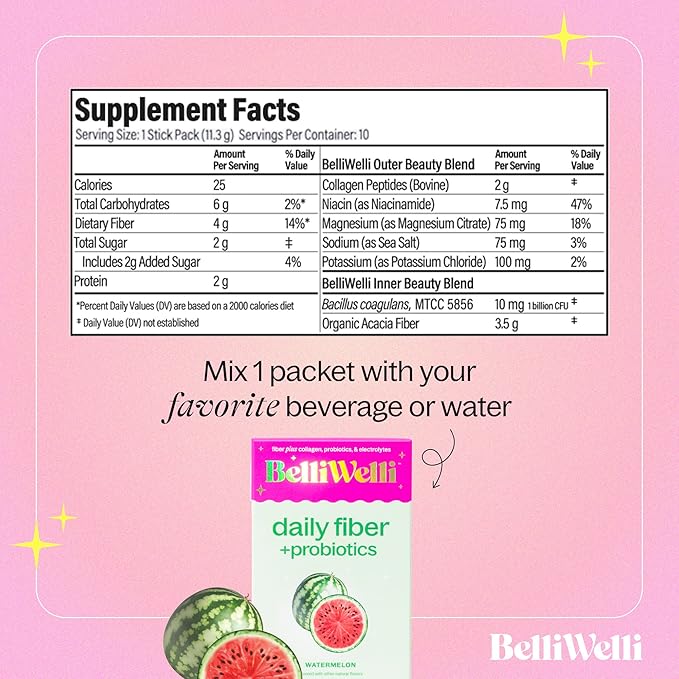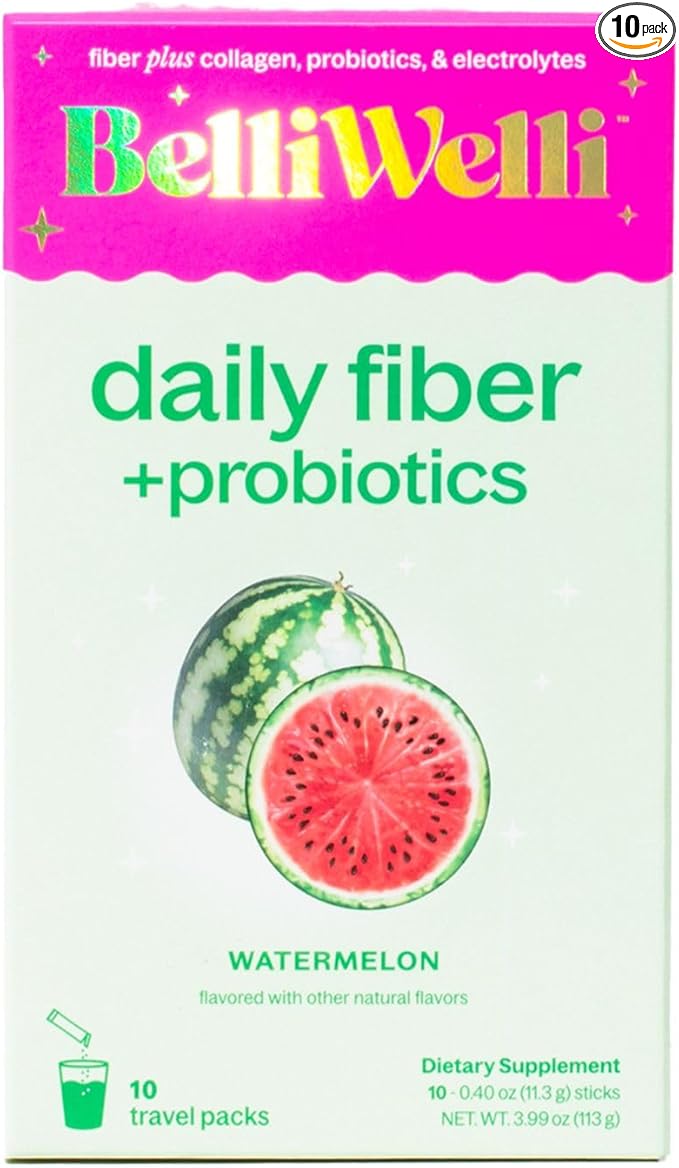 Daily Fiber Supplement Packets with Collagen, Probiotics & Electrolytes | Single Serve Packets for Gut Health, Digestion & Debloating | Watermelon | 10 Count