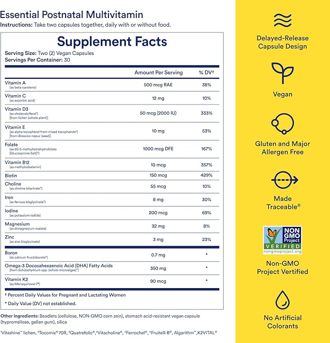 - ESSENTIAL FOR WOMEN POSTNATAL MULTIVITAMIN: is for the arrival of a mother’s new nutrient needs. It’s formulated with 15 key nutrients for 6 months postpartum, and throughout lactation. Our formula is vegan, sugar-free, gluten-free, dairy-free, nut-free, soy-free, and formulated without stevia, sugar alcohols, and artificial colors, flavors, or sweeteners. Each serving provides 350mg of Omega-3 DHA.*