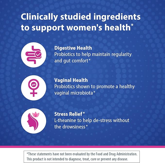- Stress relief: Blended with the amino acid, L-theanine, for fast-acting stress support without the drowsiness, making a women's health and stress relief supplement that holistically supports digestive, vaginal, and emotional health.*