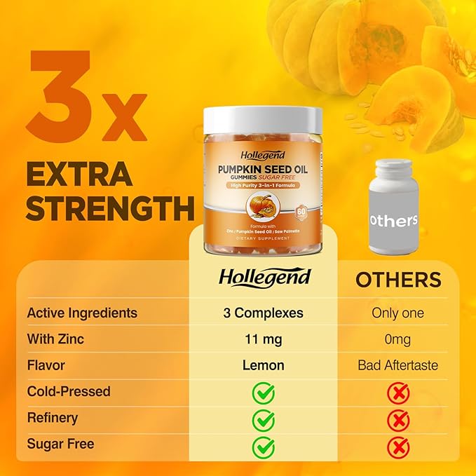 - NATURAL & SAFE: Hollegend pumpkin seed oil supplements for men and women are made from premium ingredients and are sugar-free. Each gummy is pectin-based, vegan, non-GMO, and gluten-free