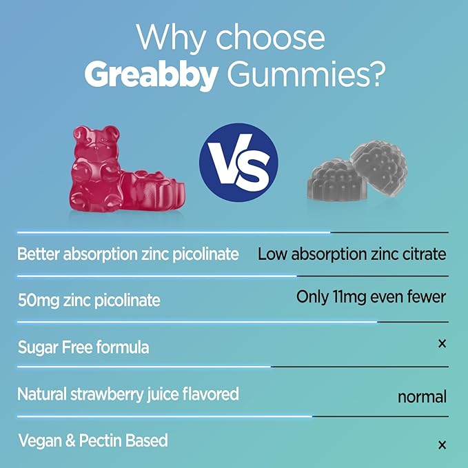- Convenient & Tasty Gummies: Greabby zinc picolinate gummies are vegan and GMO-free, and manufactured in a GMP-certified factory. These tasty and chewable gummies make it easy and enjoyable to get your daily zinc intake
