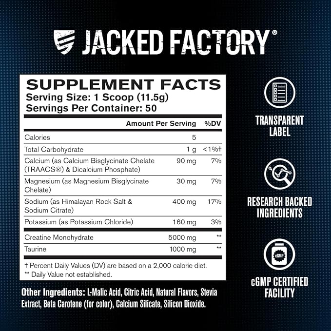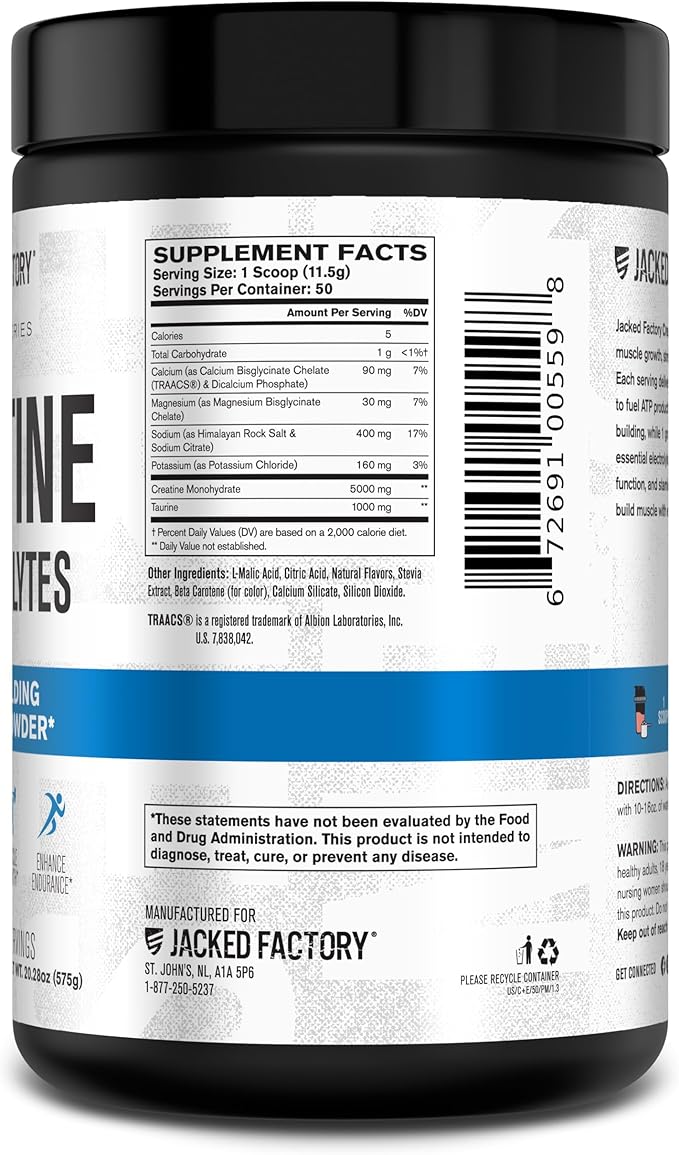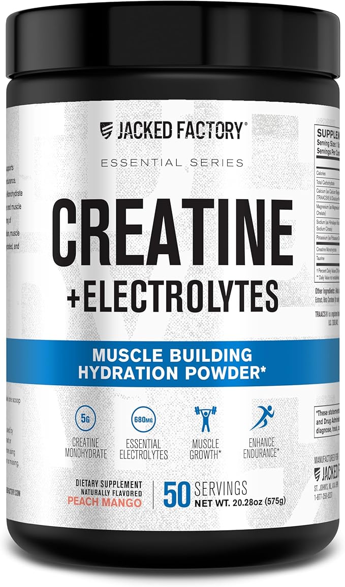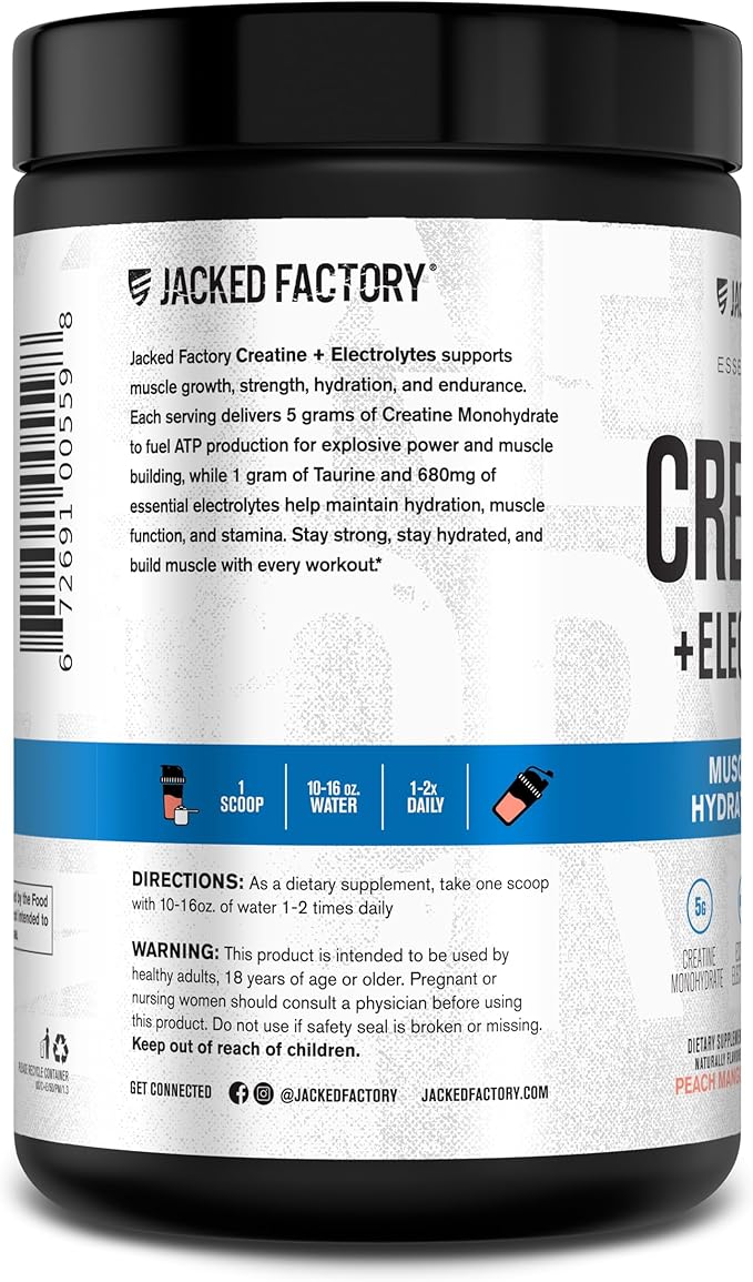 Jacked Factory Creatine + Electrolytes - Creatine Monohydrate with Taurine, Calcium, Sodium, & Potassium to Increase Muscle Growth, Strength, Hydration, & Endurance - 50 Servings, Peach Mango