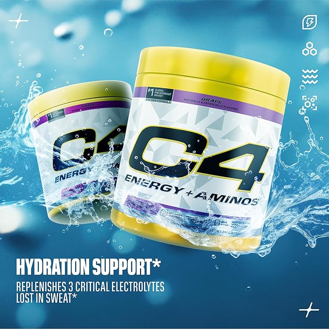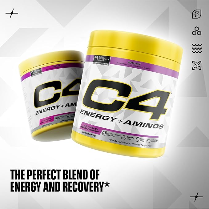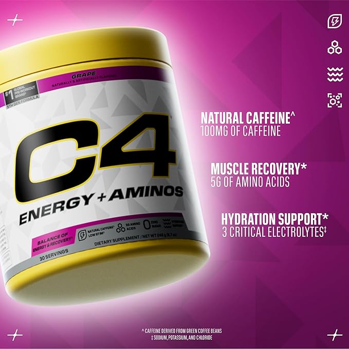 Cellucor C4 Energy + Aminos Powder | 5g BCAAs & EAAs for Muscle Recovery, 3 Electrolytes for Hydration, 100mg Natural Caffeine | Pre Workout | Zero Sugar, 30 Servings, Grape