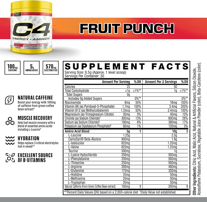 Cellucor C4 Energy + Aminos Powder | 5g BCAAs & EAAs for Muscle Recovery, 3 Electrolytes for Hydration, 100mg Natural Caffeine | Pre Workout | Zero Sugar, 30 Servings, Fruit Punch