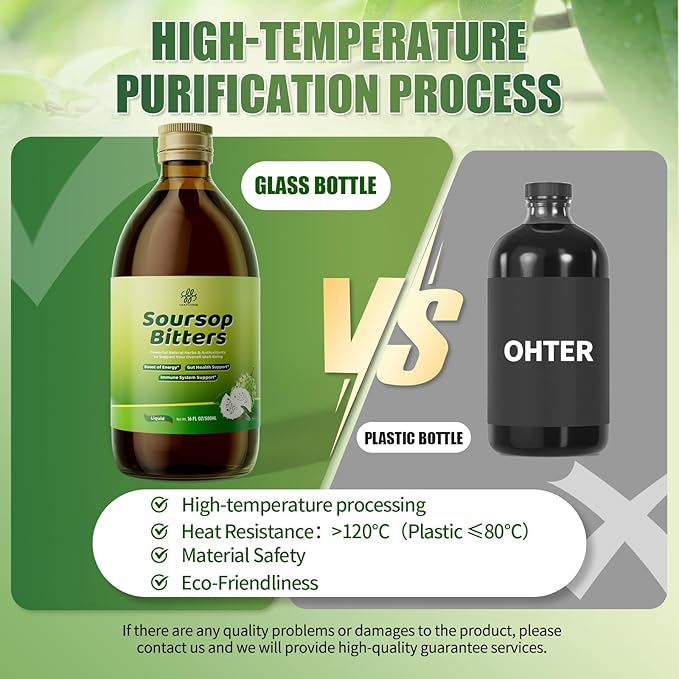 - 【Taste Upgrade & Glass Bottle Pack】Our Soursop graviola bitters contains 1662mg of soursop graviola extract. Compared with other bitter liquids,it greatly reduces the bitterness of the soursop bitter liquid, more enjoyable flavor without compromising on potency. And glass bottle packaging can effectively implement high-temperature production technology, which is safer and more environmentally friendly.