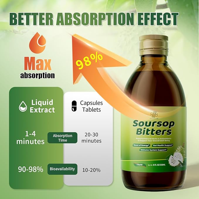 - 【Digestive & Gut Cleanse Support】Soursop bitters has a 98% absorption to gently release bowels without significant discomfort | Use as directed for effective colon cleansing and body detoxification as needed, and the turmeric in the ingredient enhances overall absorption.You can enjoy it directly for a quick and potent dose, or mix it with your favorite juice for a more flavorful experience. 2 Tablespoons/Day (about 30ml)