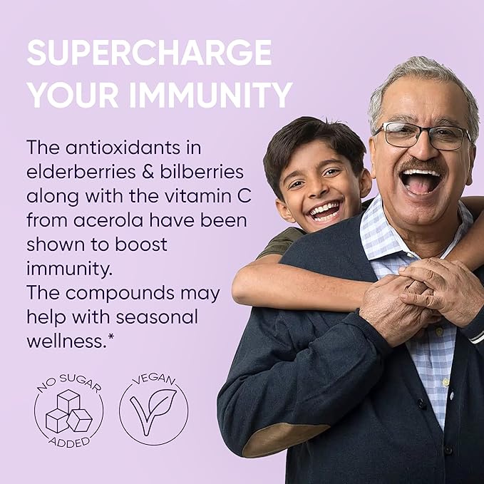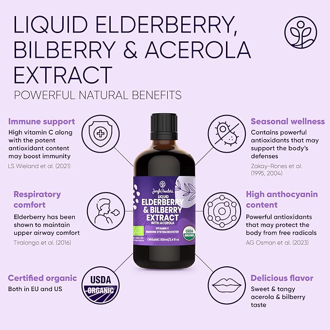 - TRIPLE-ACTION IMMUNE SYSTEM SUPPORT – Harness the combined power of organic elderberries (Sambucus nigra L.), wild bilberries, and acerola for advanced immune defense. Elderberries are renowned for their rich anthocyanins and flavonoids, which may protect cells from oxidative stress and help stimulate immune system activity. Wild Nordic bilberries provide an extra dose of anthocyanins for enhanced antioxidant and eye support, while acerola is packed with natural vitamin C to further strengthen your body’s defenses. This pure elderberry syrup organic offers a convenient, sugar free solution to keep your immune system resilient during seasonal changes and everyday challenges.