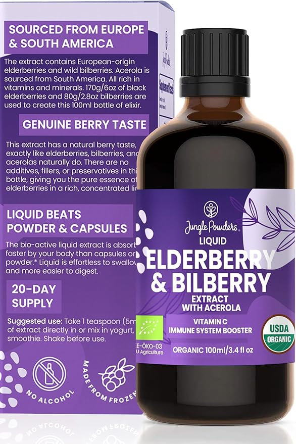 - LIQUID ELDERBERRY EXTRACT FOR FASTER ABSORPTION – Unlike capsules or gummies, our elderberry juice is a liquid formula designed for superior bioavailability. This allows your body to absorb the active compounds – anthocyanins, flavonoids, and vitamin C – more efficiently and start benefiting faster. With each serving delivering a concentrated blend of elderberry, wild bilberry, and acerola, you’ll quickly feel the difference as this potent combination supports your immune system and overall vitality.