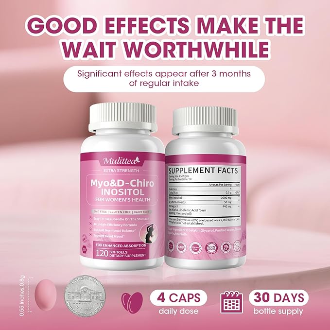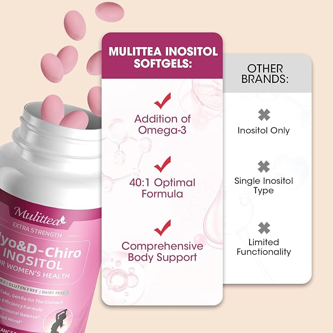 - Gentle on the Stomach:MULITTEA's inositol supplement for women is vegan,dairy-free, GMO-free, with no artificial fillers. These softgels are smaller than traditional capsules, easier to swallow and gentle on the stomach, making them your ideal health companion