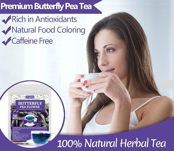 50 Premium Butterfly Pea Flower Tea Bags, Made with 100% Natural Butterfly Pea Flowers, No Additives & Caffeine Free.