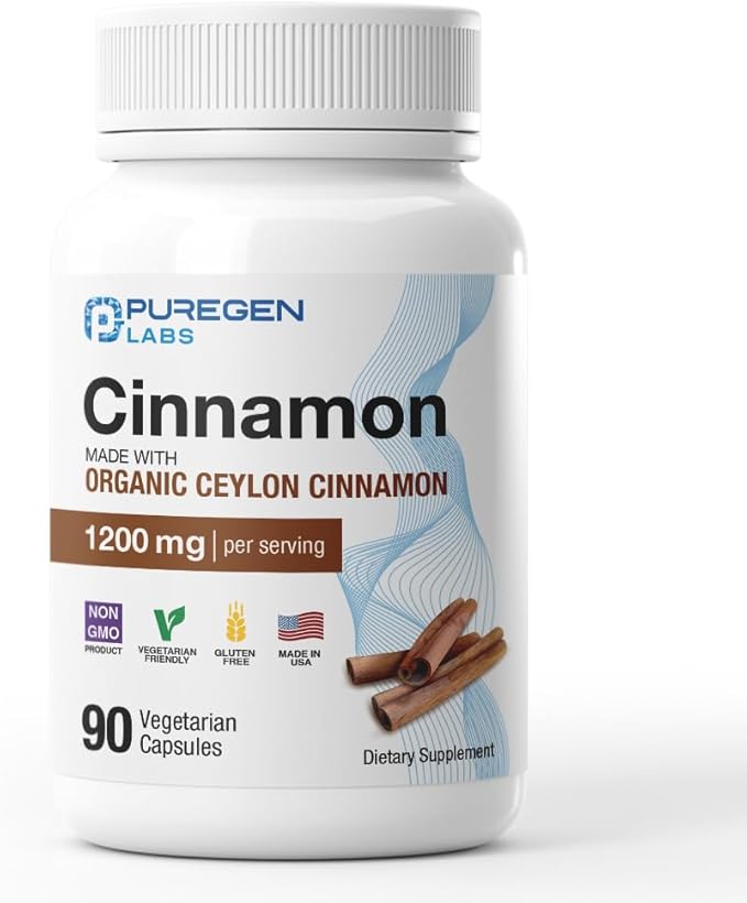 - ✅ Organic Cinnamon: Puregen Labs Cinnamon provides 1200 mg per serving and is made with Organic CEYLON Cinnamon.