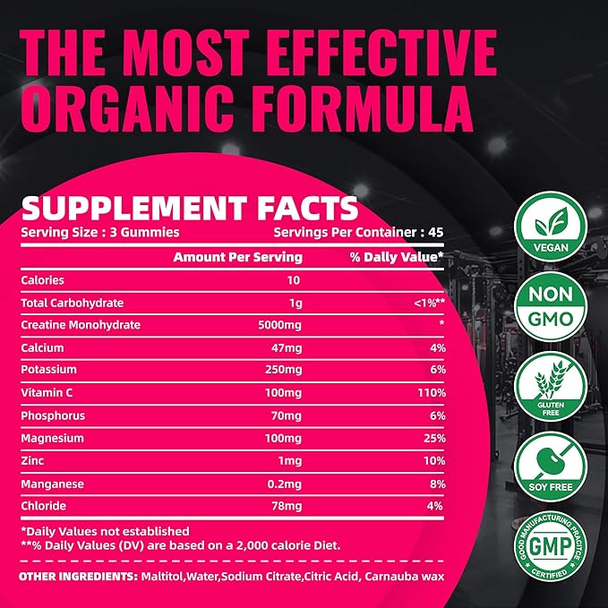 - [Vegan, Gelatin Free, Sugar free]: Each bottle contains 135 count vegan, non-GMO & gluten-free, sugar free creatine monohydrate gummies. Super delicious.