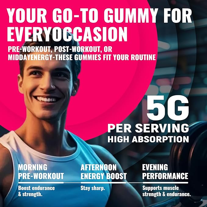 - [ Key Benefits]: Our Creatine monohydrate gummies are an easy way to consume, 3 gummies per serving, you can take it at any time, any place. It improved muscle strength, muscle recovery, improve endurance and energy boost. Suitable for a variety of users, and enjoyable taste.