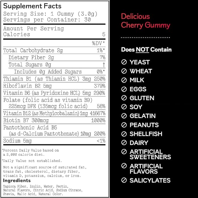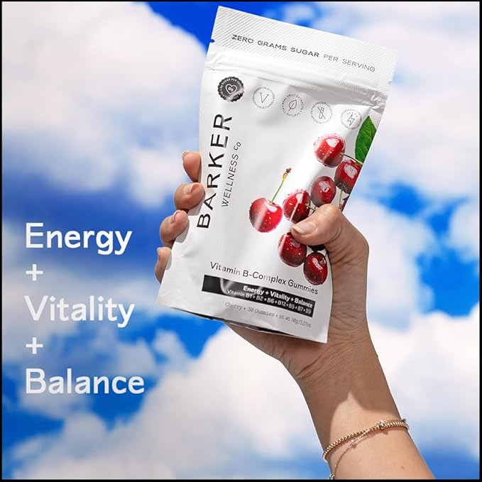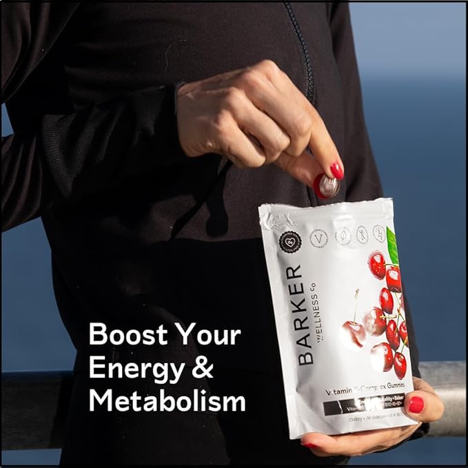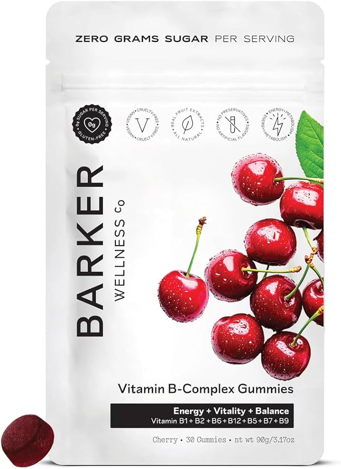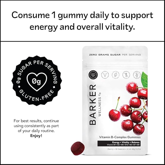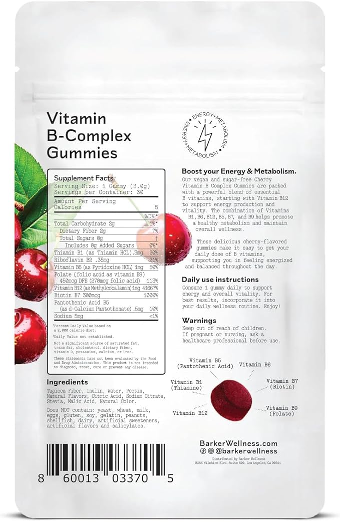 Barker Wellness Vitamin B-Complex Gummies | Energy & Metabolism Support | B1, B5, B6, B7, B9, B12 | Vegan, Sugar-Free | Cherry Flavor | 30 Gummies