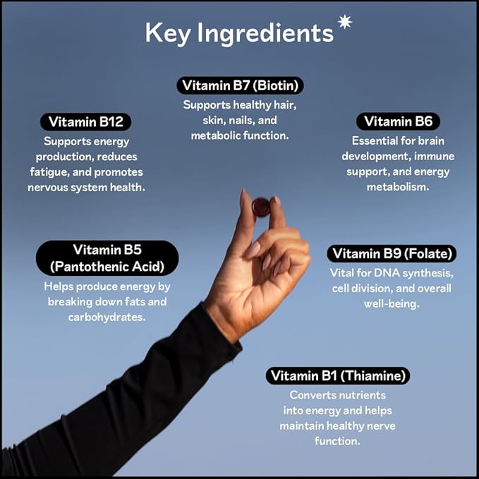 - All-in-One B-Vitamin Blend: Provides B1, B5, B6, Biotin (B7), Folate (B9), and B12—nutrients that support energy production and metabolism.
