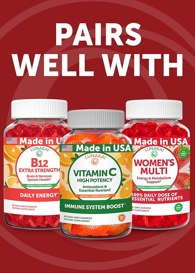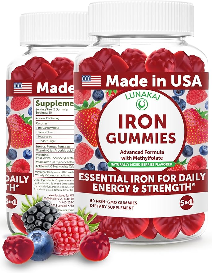 Lunakai USA Made 100% Daily Value Iron Gummies with Vitamin C, B12 & Methylfolate – Vegan Iron Supplement for Women, Men & Kids – Non-GMO Iron Gummy for Energy & Strength, 60ct