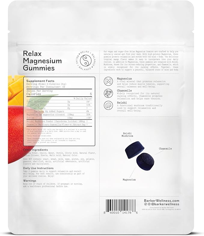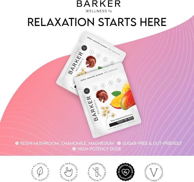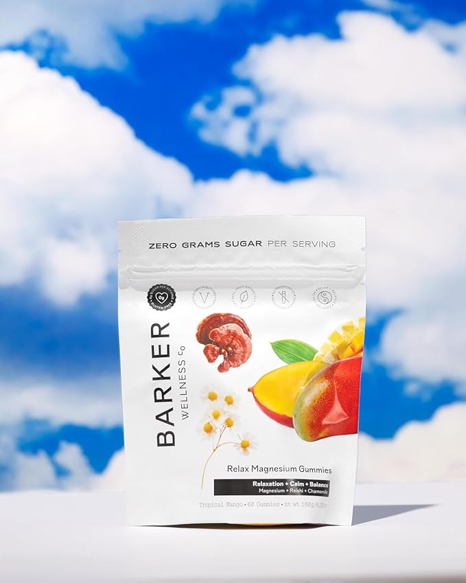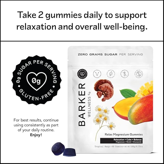 Barker Wellness Relax Magnesium Gummies | Stress Relief, Muscle Tension & Relaxation | Reishi Mushroom & Chamomile | Vegan, Sugar-Free | Tropical Mango | 60 Gummies