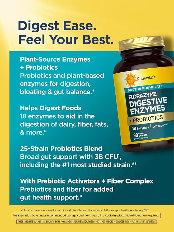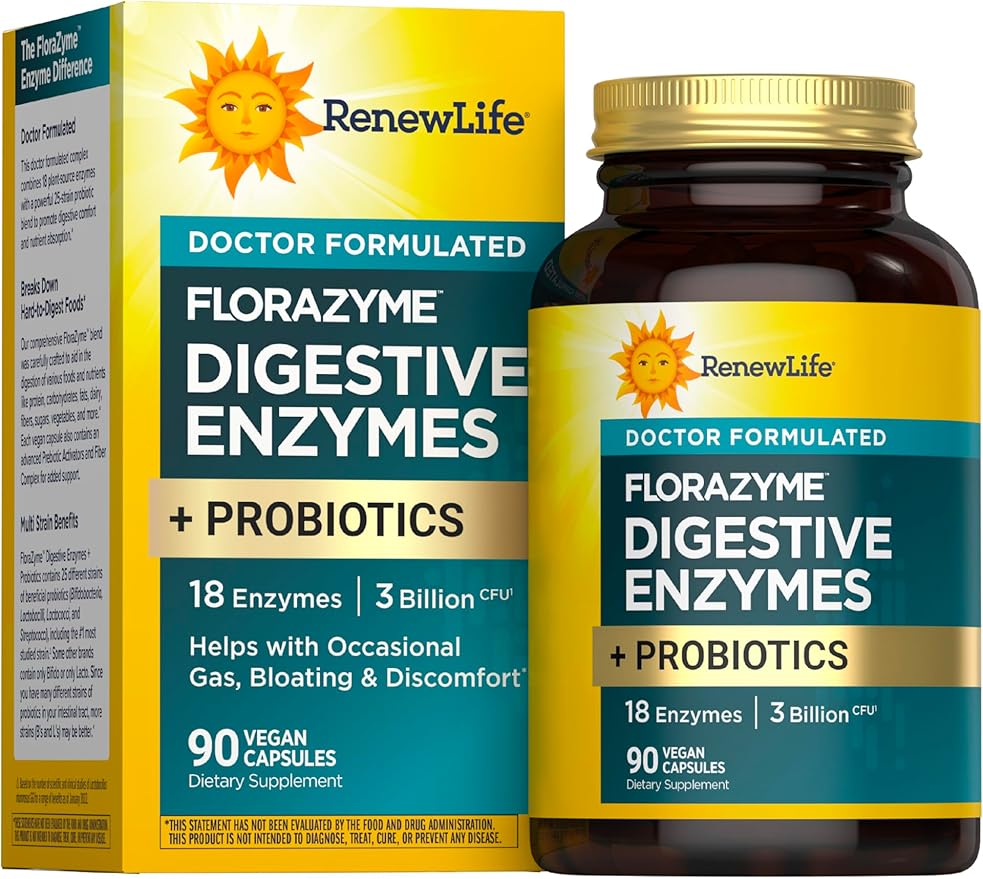- Florazyme Digestive Enzymes + Probiotics: Combines 18 plant-sourced enzymes with 3 billion CFU** of probiotics to support digestion and nutrient absorption*