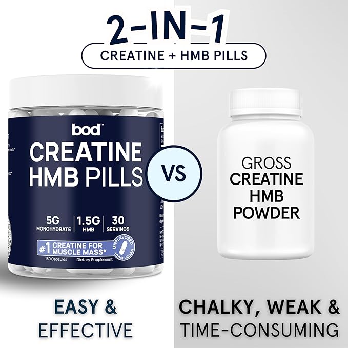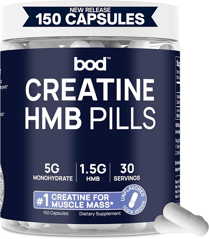 BOD Creatine HMB Capsules, Creatine Monohydrate Powder with HMB for Muscle Growth, Increased Strength, Energy, and Performance - No Bloat, No Load, Unflavored, Vegan, 150 Capsules, 30 SVG