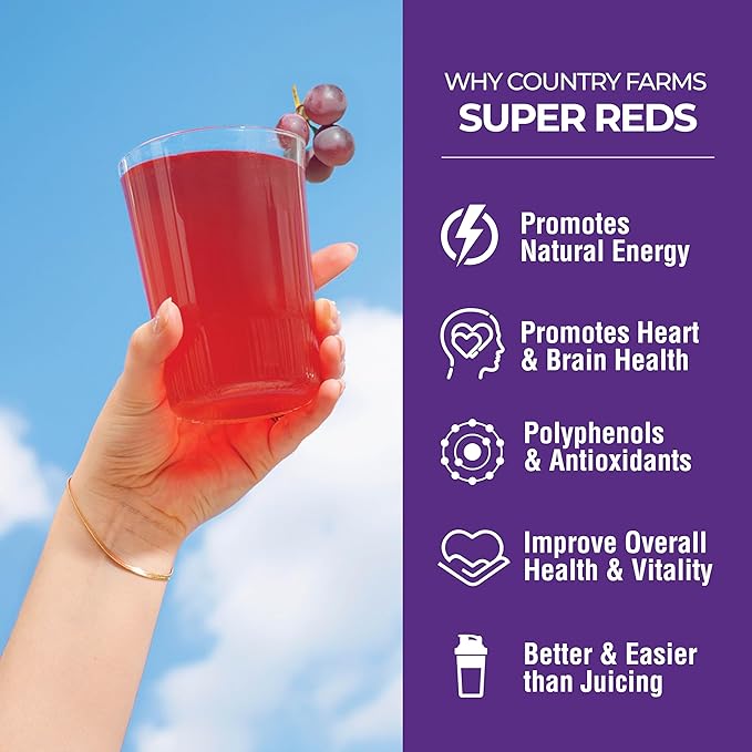 - NATURAL ENERGY BOOST & METABOLISM SUPPORT. Infused with Vitamin C, Vitamin A (from beta-carotene), potassium, and polyphenols, Country Farms Super Reds Grape Flavor superfood powder helps your body convert food into energy more efficiently while reducing fatigue. Whether you're hitting the gym or getting through a busy workday, this clean energy boost is caffeine-free and derived from fruits and vegetables—ideal for sustained vitality without crashes.
