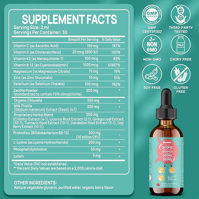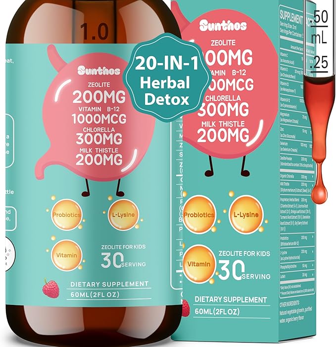 200mg Zeolite Detox for Kids & Adults, 20-in-1 Herbal Liquid with 300mg Chlorella, 200mg Milk Thistle, Cilantro, Vitamins & Probiotics Supports Speech, Cleanse, Immune & Gut Health, Berry Flavor, 60ML