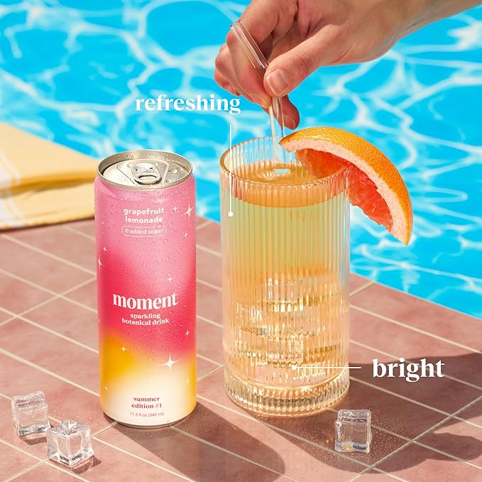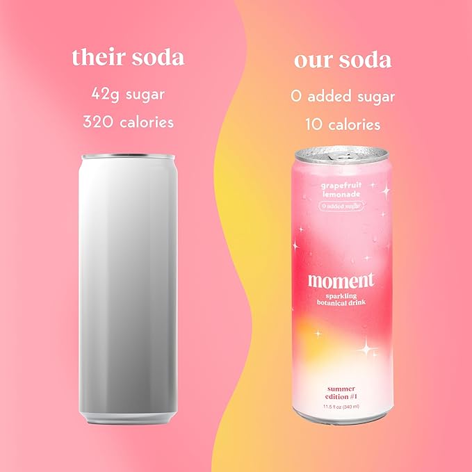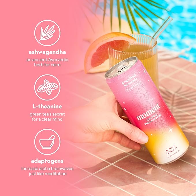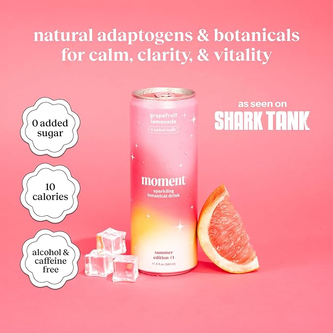 Moment Botanical Soda Soft Drink (Shark Tank) - SPARKLING Non Alcoholic Drinks | Grapefruit Lemonade | L-Theanine & Ashwagandha for Calm & Clarity | 0 Added Sugar 0 Caffeine | 12-pack