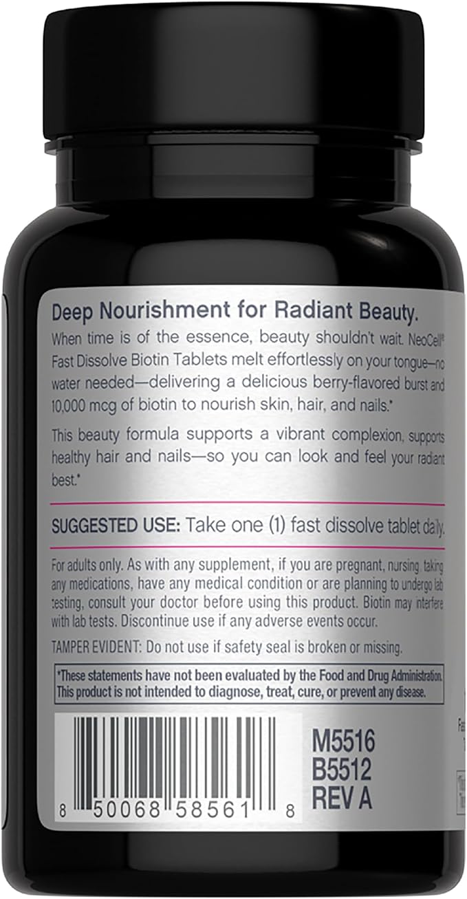 - Fast Dissolve Biotin: Imagine starting your day with a burst of berry flavor that dissolves effortlessly on your tongue—NeoCell’s Biotin 10,000 mcg fast dissolve tablet transforms your beauty routine into a moment of ease and indulgence.