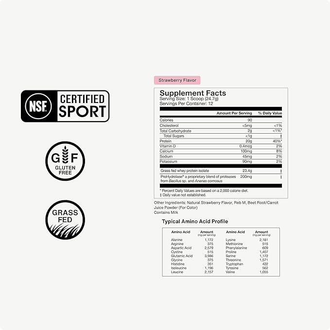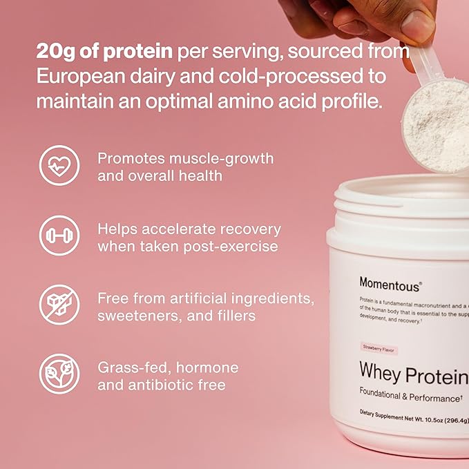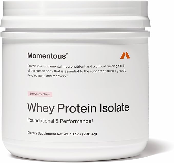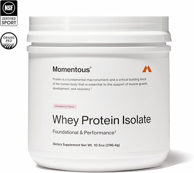 Momentous Essential Grass-Fed Whey Protein Powder - 20 g Whey Isolate Protein - NSF Certified for Sport - Gluten-Free - 12 Servings for Essential Everyday Use - Strawberry - Package May Vary