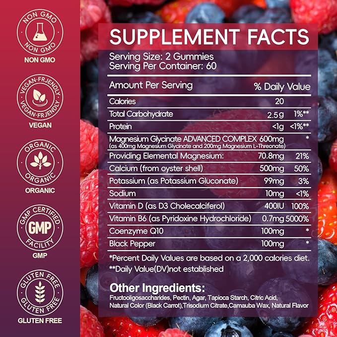 - 0 SUGAR VEGAN FRIENDLY: Natural Magnesium Glycinate Gummies are blended with the unique taste of Mixed berry, are free of magnesium gummy and gluten, and the vegetarian-friendly gummies allow you to enjoy a pleasant experience when taking your daily supplement.