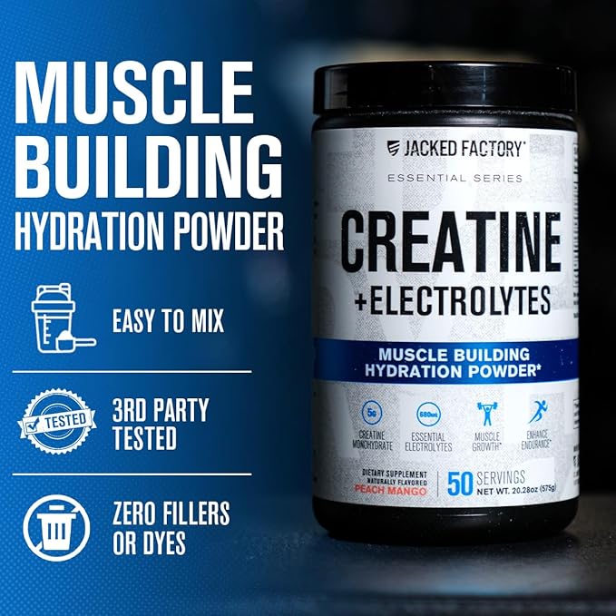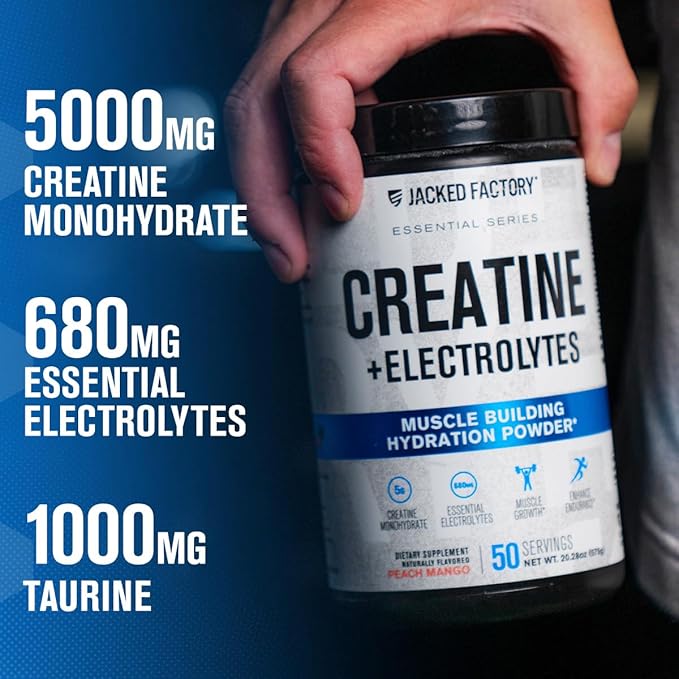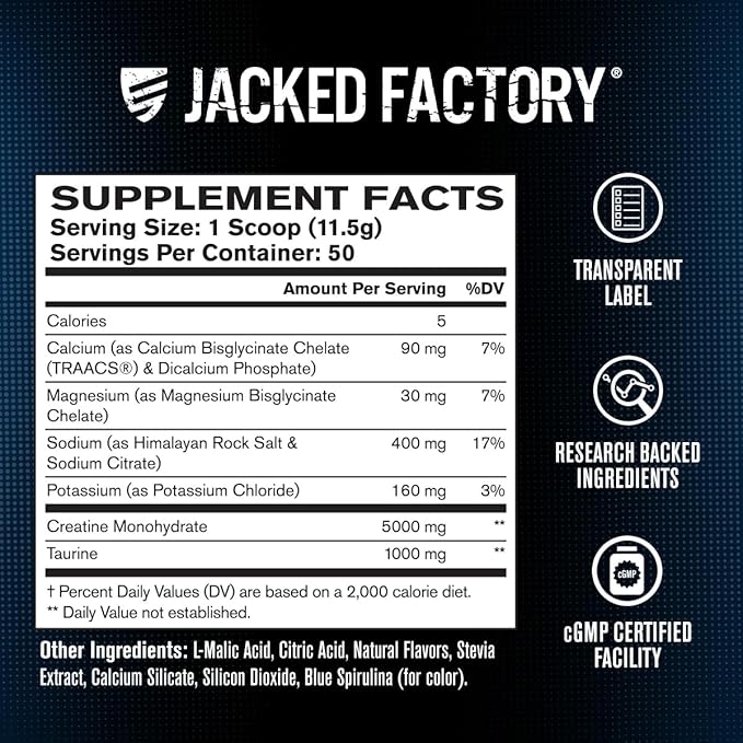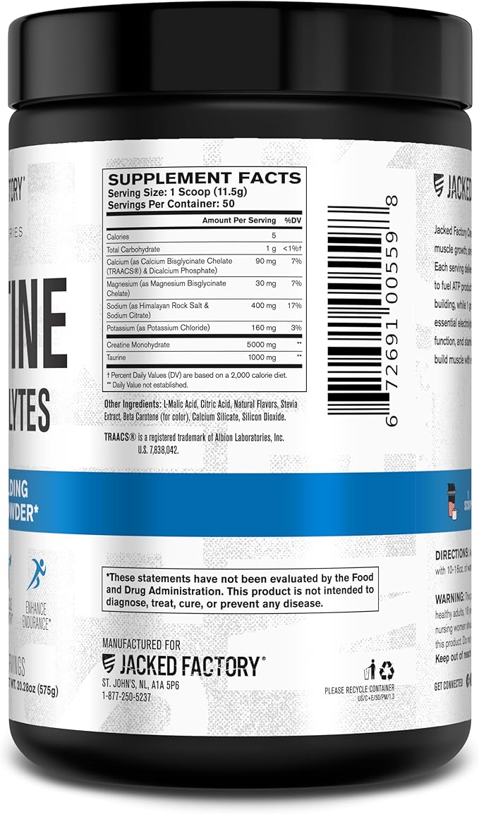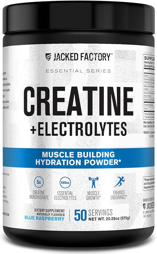 Jacked Factory Creatine + Electrolytes - Creatine Monohydrate with Taurine, Calcium, Sodium, & Potassium to Increase Muscle Growth, Strength, Hydration, & Endurance - 50 Servings, Blue Raspberry
