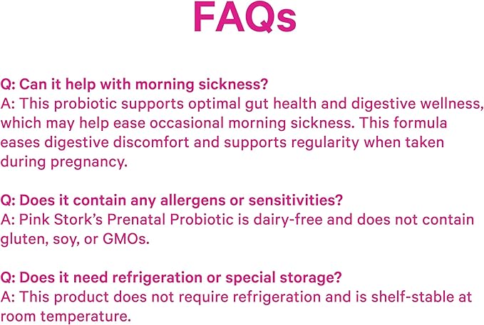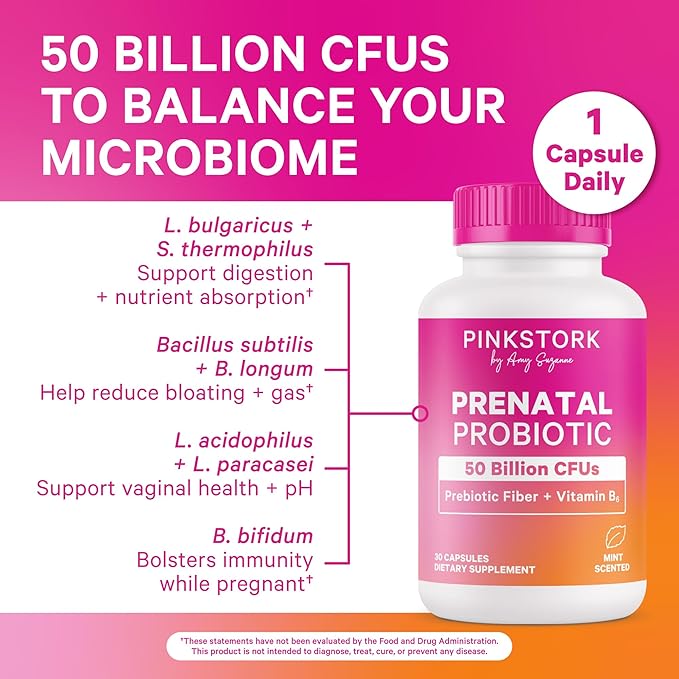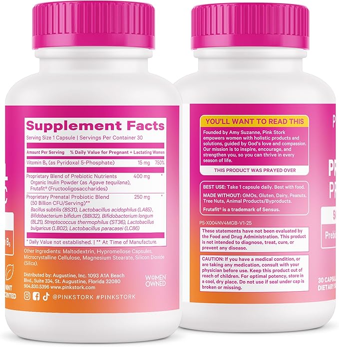 - Does your prenatal supplement ritual start and end with a prenatal vitamin? Pink Stork Prenatal Probiotic is formulated JUST for pregnant women with Vitamin B6, Inulin Prebiotic Fiber, and SEVEN spore-based probiotic strains to target prenatal needs - specifically digestive wellness (which impacts morning sickness!), constipation, and hormone support. Take one small capsule daily with your Pink Stork Prenatal Vitamins.
