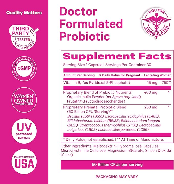 - Pink Stork Prenatal Probiotic blend contains prebiotic fiber Inulin, Vitamin B6, and seven probiotic strains, including Bacillus Subtilis and Lactobacillus Paracasei for prenatal immune support, nutrient absorption, and gut flora balance -- these are essential for your developing baby's growth, and can help their microbiome later in life!