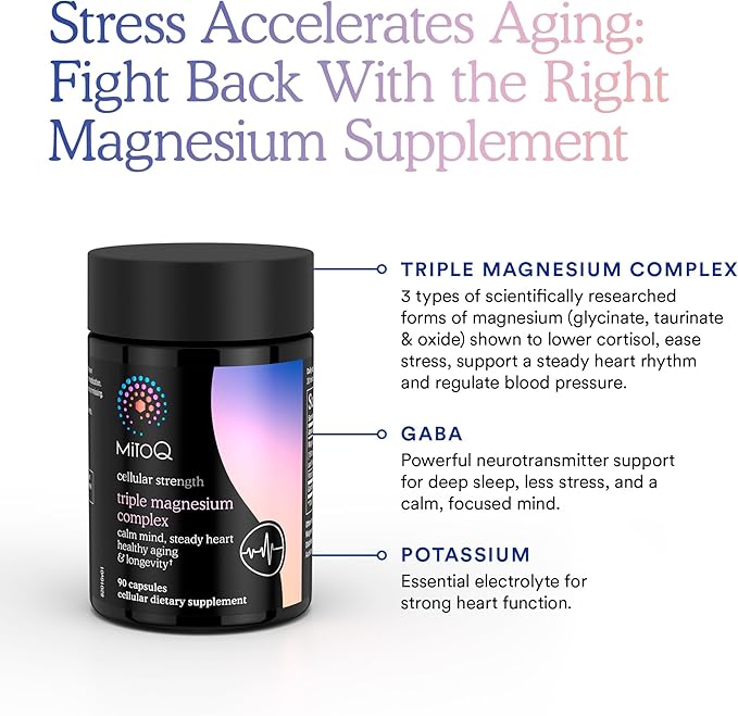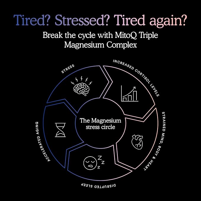 - ONE OF THE ONLY MAGNESIUM SUPPLEMENTS DESIGNED TO TARGET STRESS AT THE SOURCE: Everyday stress can deplete magnesium, which in turn raises cortisol levels – creating a cycle of tension, fatigue, and poor sleep impacting heart health. MitoQ Triple Magnesium Complex is uniquely formulated to replenish these levels and break the stress circle, helping you feel calmer and more resilient.