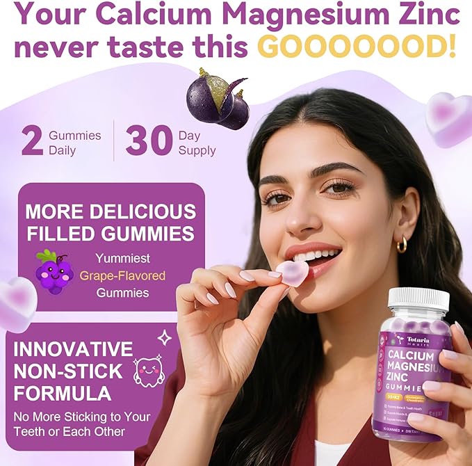 - Sugar-Free, Vegan & Family Friendly: Produced in a cGMP-certified, FDA-registered facility to ensure strict safety, purity, and quality standards. Our natural grape-flavored calcium magnesium zinc d3 supplement contains no added sugar, gelatin, or common allergens. Made with plant-based pectin and advanced non-stick technology for superior taste, texture, and stability. Gluten-free, dairy-free, peanut-free, and egg-free —safe and effective for the whole family.