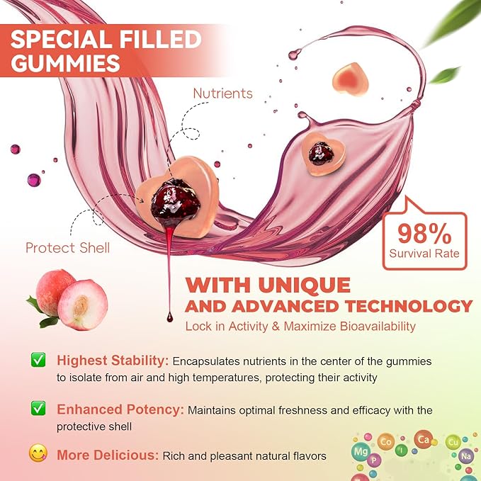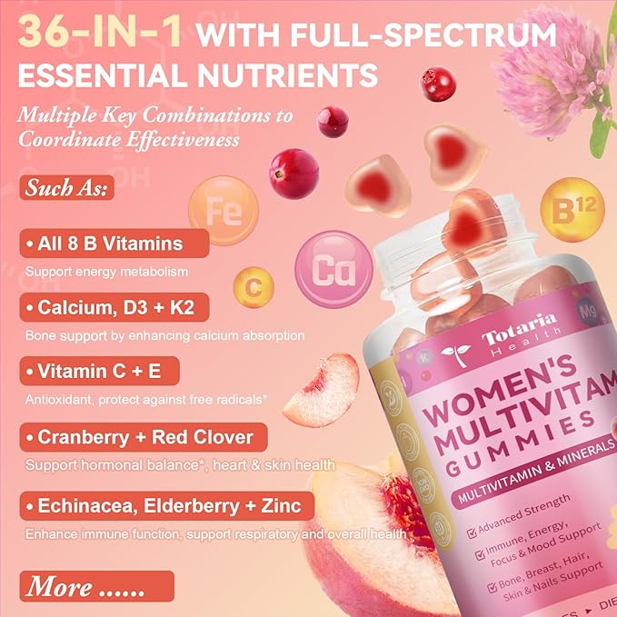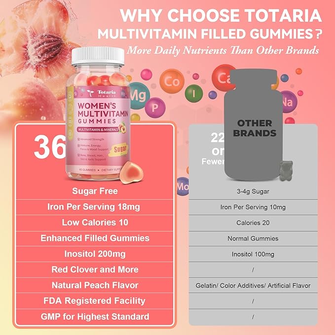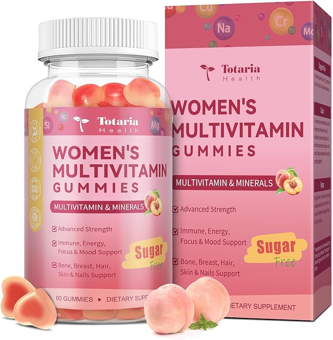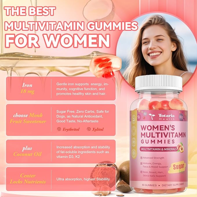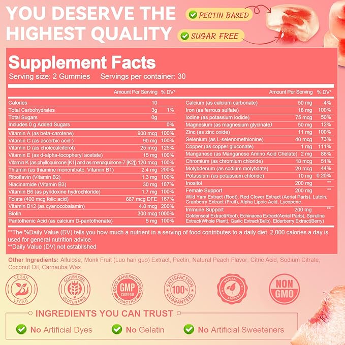 Sugar Free Multivitamin Gummies for Women 14+ w/Iron, Inositol, Folate, Biotin, Womens Daily Multivitamin Gummy w/Vitamin A, C, B, D3, K2, for Hair, Skin, Energy, Immune, Peach Flavor
