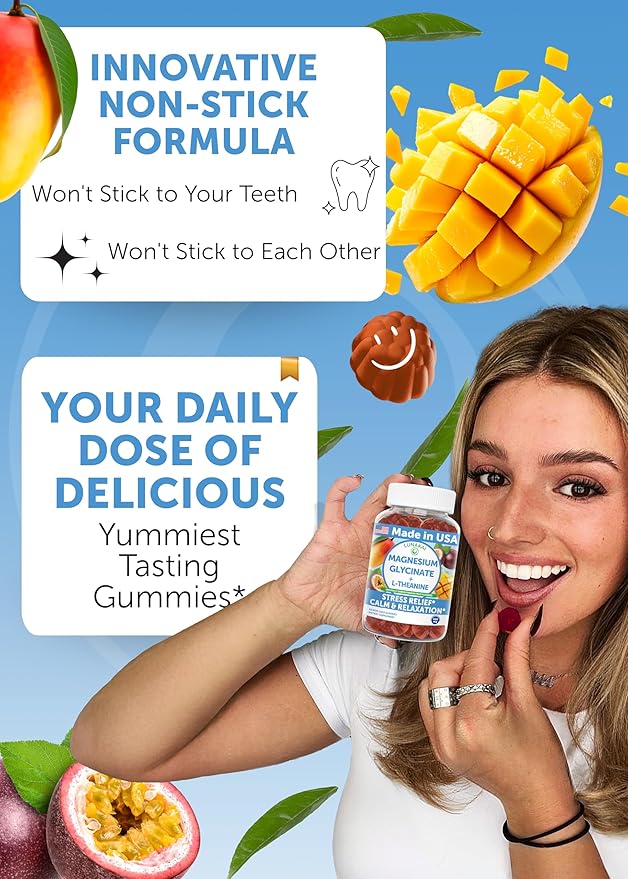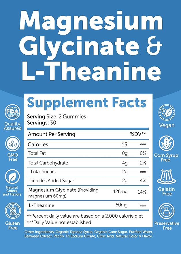 - L-Theanine + Magnesium Gummies — Contains 426mg of magnesium glycinate and L-Theanine in tasty magnesium gummies to support calm and relaxation in chewable form.