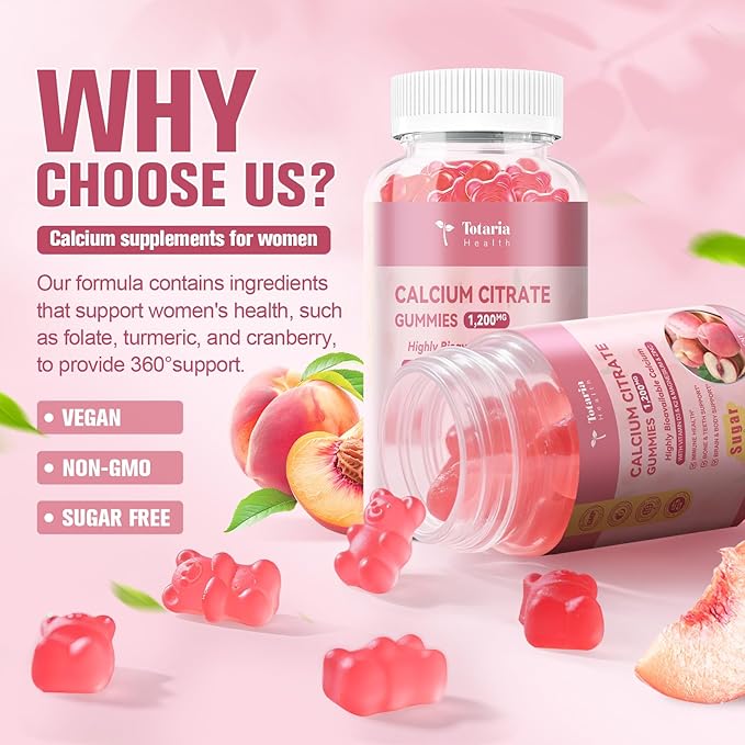 - Delicious & Sugar Free - Our gummies are naturally peach flavored, 120 gummies (60 day supply total), vegan, pectin-based, non-GMO, gluten-free, with zero added sugar and no artificial flavors. It is an easy to chew calcium supplement for children, adults, women and seniors.