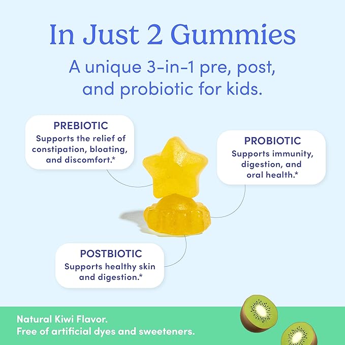 - Clinically Tested Tribiotic for Kids: Made with clinically studied pre+, post+, and probiotics to support a balanced gut microbiome. Just 2 tribiotic gummies a day fight bathroom accidents and tummy aches. The clinically studied prebiotic, Livaux, supports regular bowel movements and softer stools.